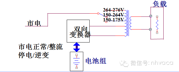 在線互動(dòng)UPS與后備式比,主要區(qū)別在于:逆變器與充電器合二為一;輸出通過(guò)變壓器的抽頭跳變,實(shí)現(xiàn)分段穩(wěn)壓。