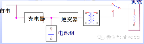 停電后,啟動(dòng)逆變器,把電池儲(chǔ)存的能量通過(guò)逆變器和開(kāi)關(guān)供給負(fù)載。