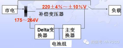 Delta變換UPS運(yùn)行原理Delta變換器和補(bǔ)償變壓器實(shí)現(xiàn)穩(wěn)壓功能,主變換器是雙向變換器。不能穩(wěn)定頻率。